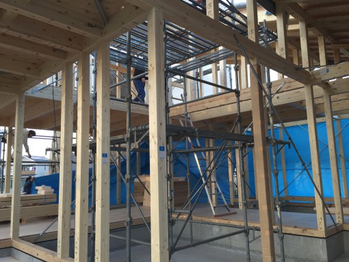 ガレージ上部の”のぼり梁”を丁寧に組み上げています。